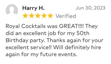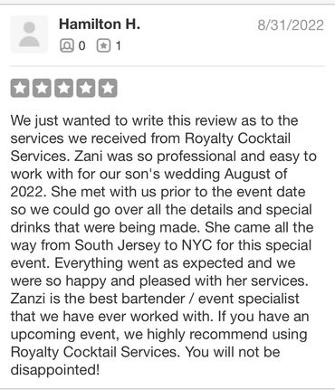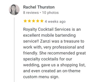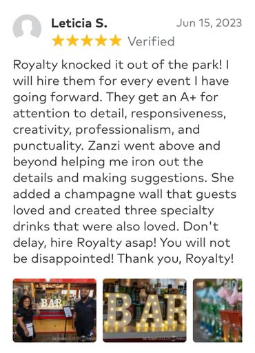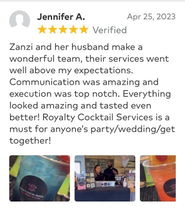 Royalty Cocktail Services was created because I enjoy entertaining and helping people have a good time. I have been known to be "the life of the party" and I want to bring that energy to all that I work with.